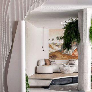 En colaboración con HUEST, Angelina Sanz presentó “Oasis” en Marbella Design & Art 2023. Este espacio, inspirado en el desierto, ofrecía una explosión de texturas y colores naturales, creando un ambiente de calma y elegancia. El diseño diferenciaba dos zonas: una área de estar con un sofá de líneas sinuosas y una zona de spa con un revestimiento en relieve de curvas asimétricas. La combinación de materiales nobles y tecnología avanzada reflejaba la sinergia entre belleza y funcionalidad.